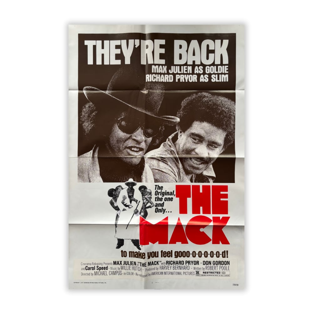 Original 1977 US one sheet poster for the theatrical rerelease of “The Mack” (1973), starring Max Julien and Richard Pryor. Folded as issued, with bold artwork that captures the grit, style, and street legend of this blaxploitation classic.